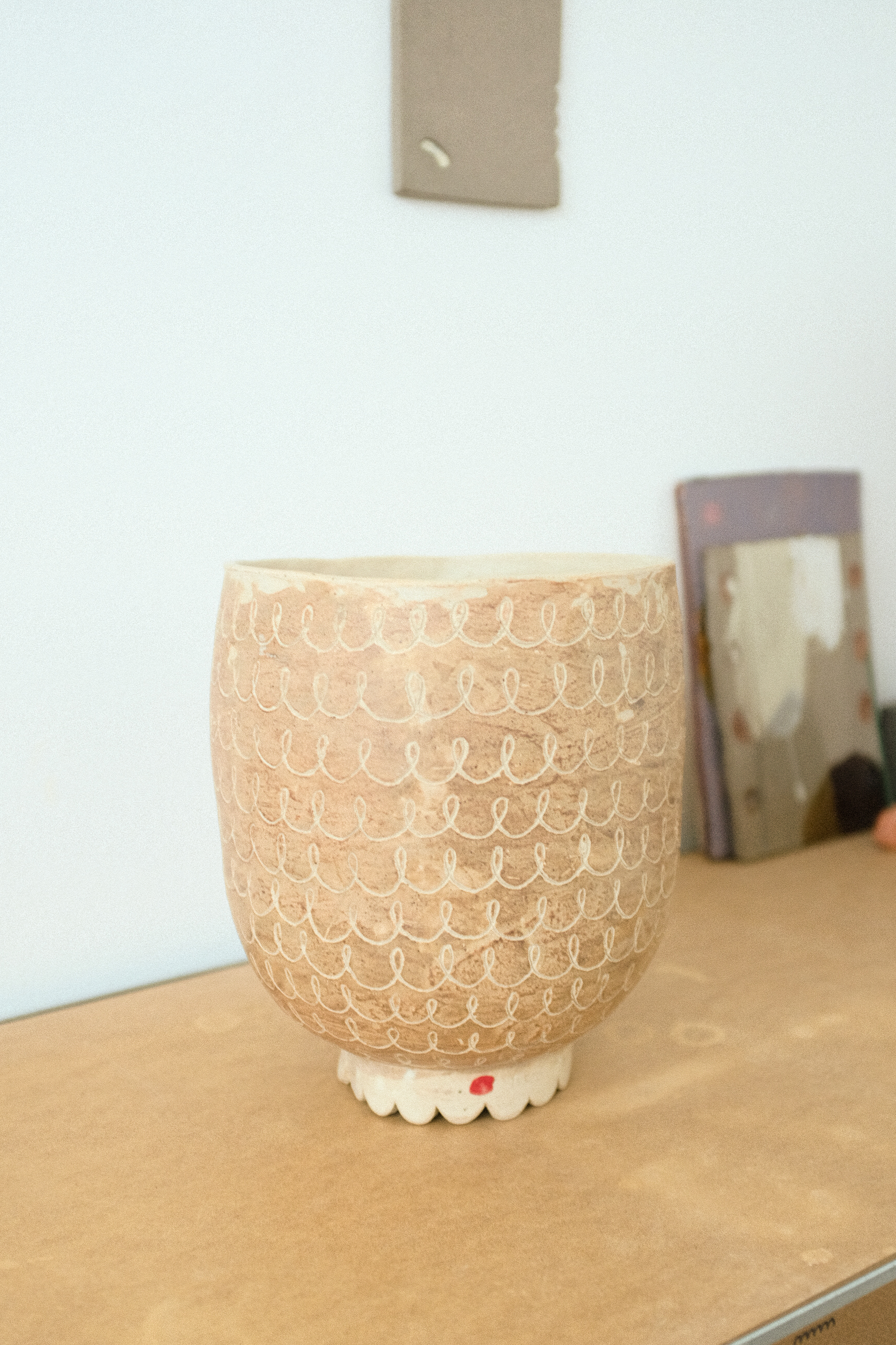 White stoneware, various slips, glazed only inside, burnishing technique outside.