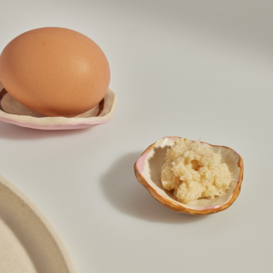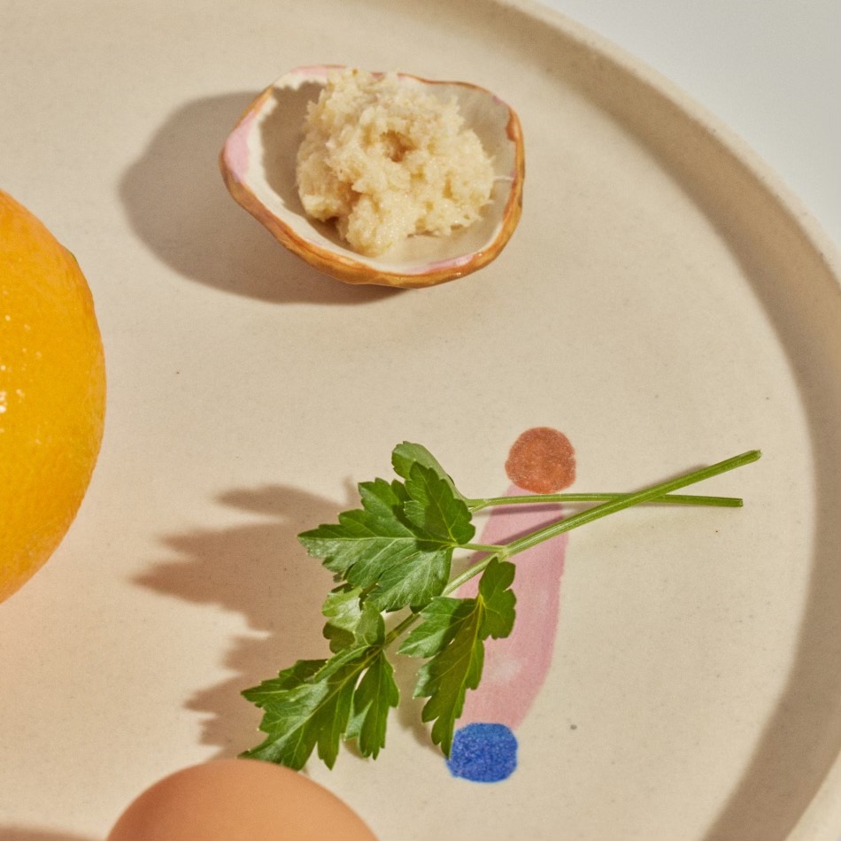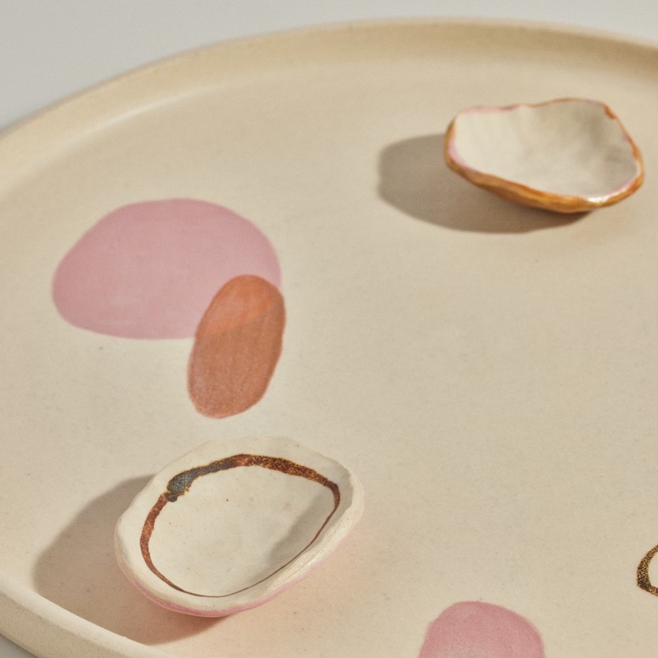 Stoneware thrown seder plate with two hand-built dishes. Little drawings painted by hand, glazed with matte clear inside and unglazed outside, showing the raw texture of the material.