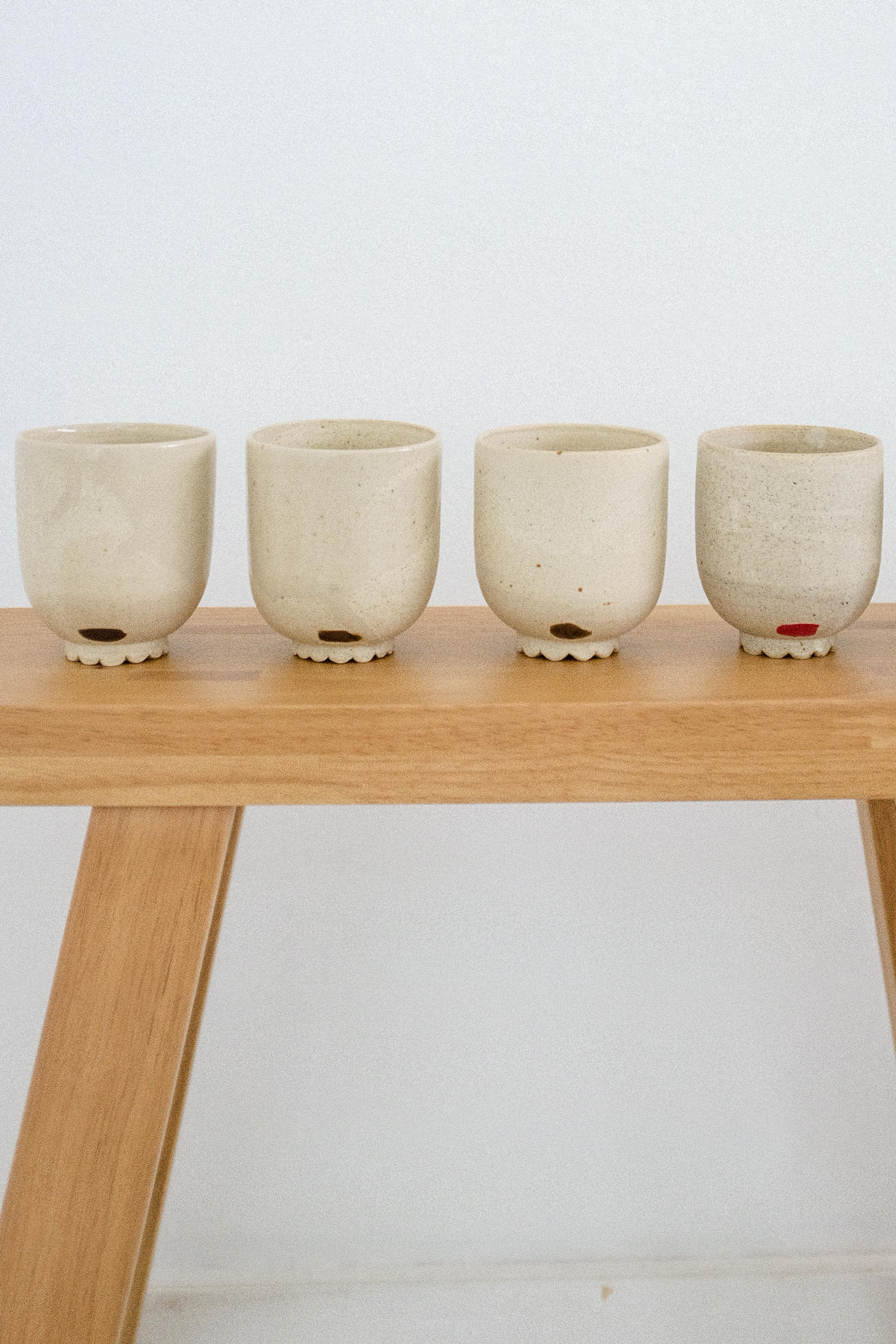Cup: White stoneware, vanilla glaze. Detail in brown or red. ø7 x 5.5 cm