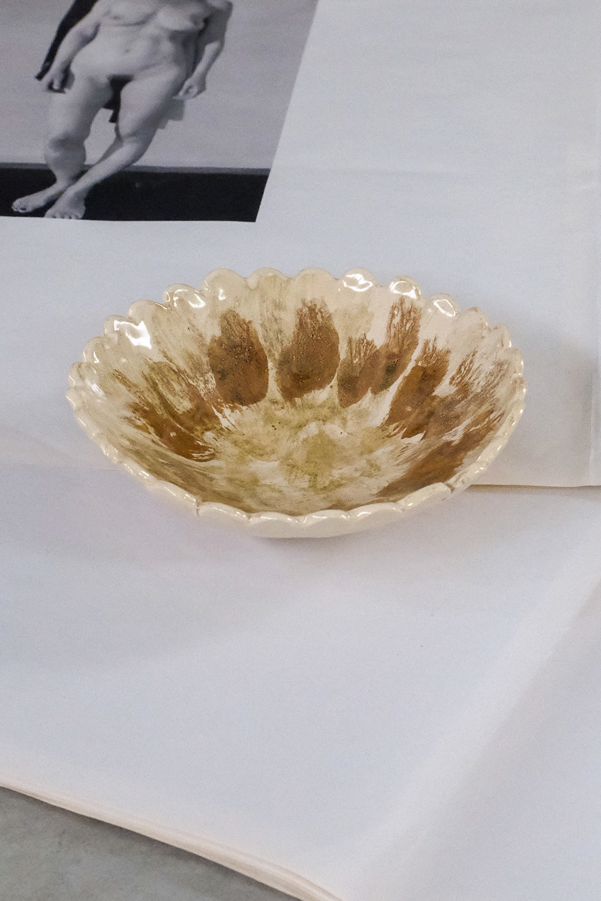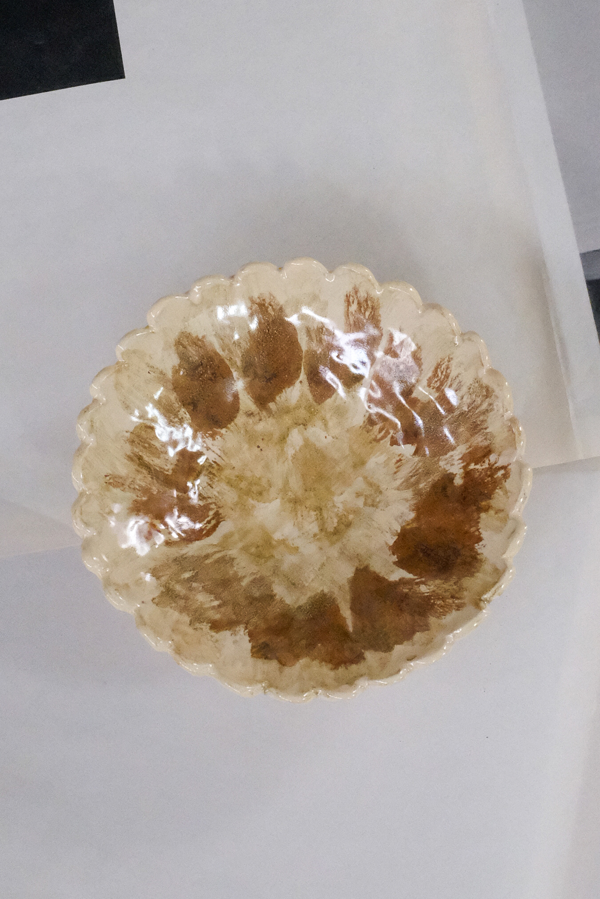 White clay, yogurt and mustard glazes, red oxide.