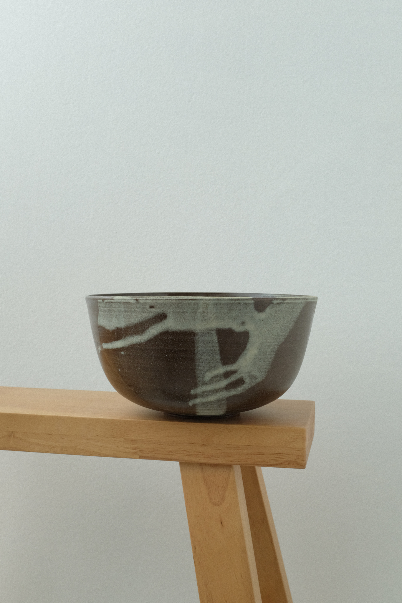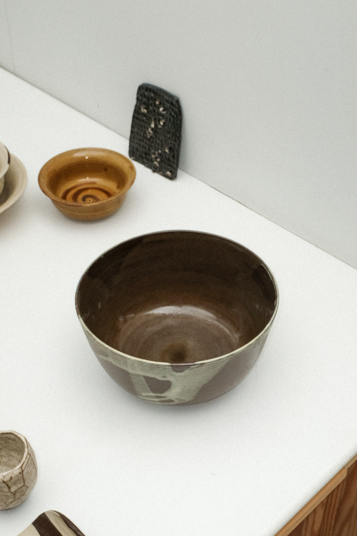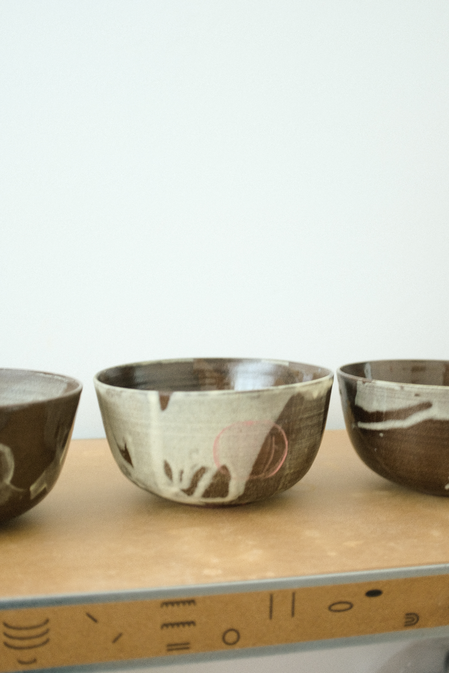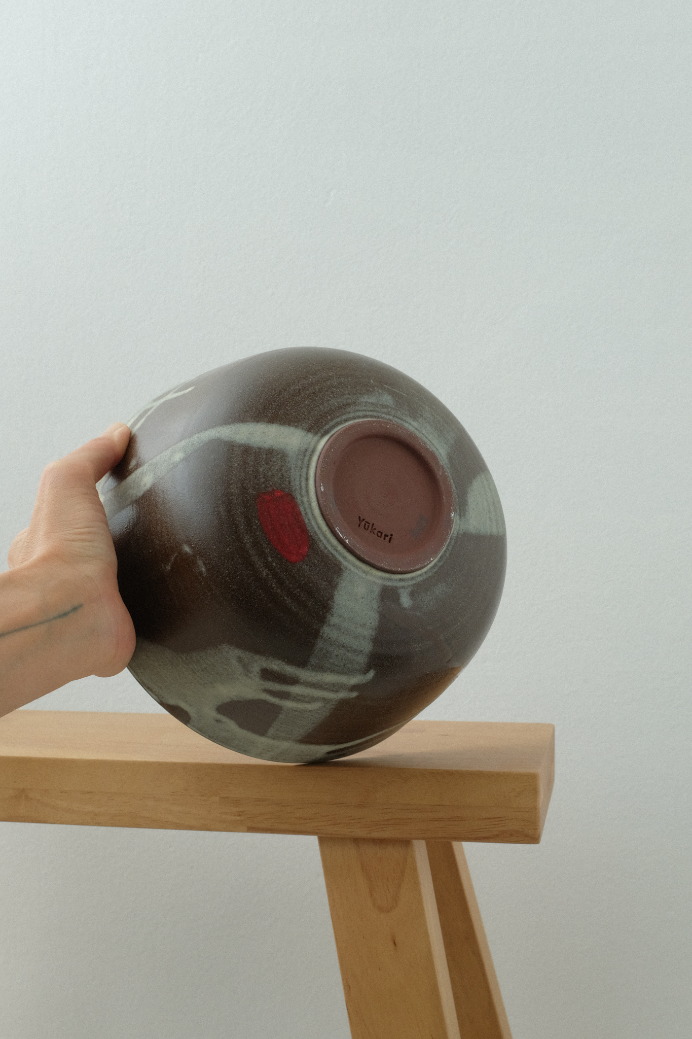 Brown stoneware, various glossy glazes inside, matte glazes outside, red detail.