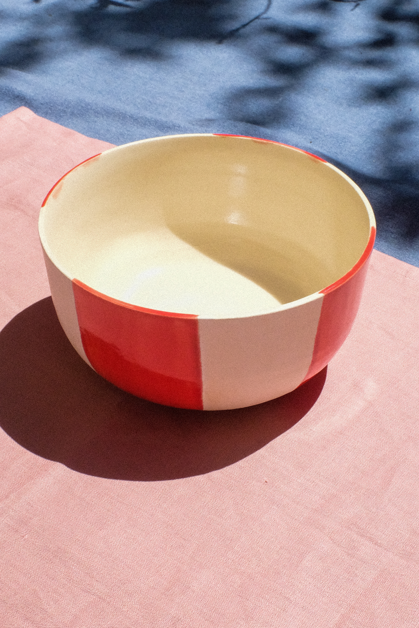 White clay, clear glaze inside, matte white and glossy red stripes.